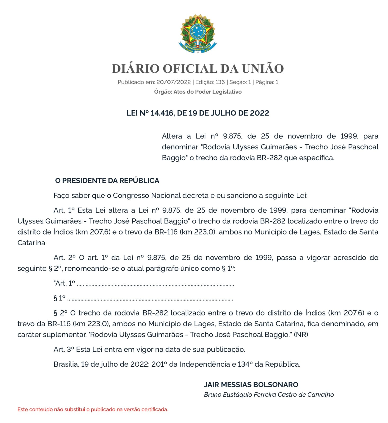 Sancionada lei que denomina José Paschoal Baggio a um trecho da BR 282
