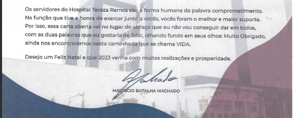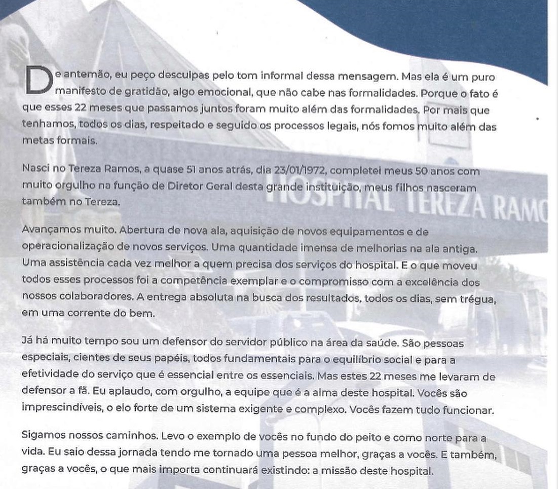 Maurício Batalha se despede da direção do Hospital Tereza Ramos com essa mensagem em suas redes sociais.