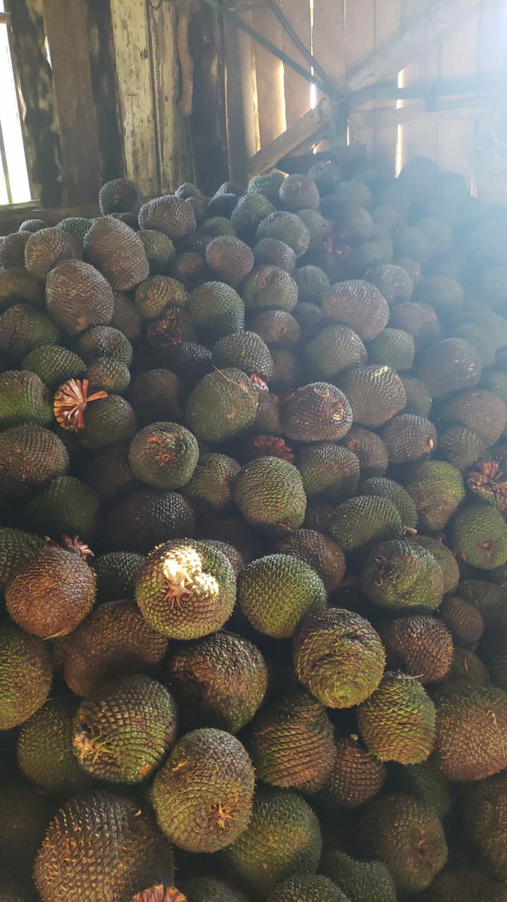 Esta é parte da colheita desta semana e há ainda muita pinha a espera para ser colhida. A máquina para separar as falhas e ensacar o pinhão ajuda no processo.