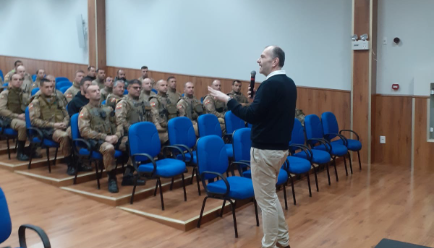 Promotor de Justiça da 12ª Promotoria da Comarca de Lages, George André Franzoni Gil, conversou com cerca de 100 Policiais Militares de Santa Catarina sobre evolução, aperfeiçoamento, identificação de crise, aprimoramento técnico e mudança de hábitos, tendo em vista o paradigma das decisões judiciais proferidas por tribunais superiores. O encontro aconteceu no auditório do curso de Engenharia da Universidade do Planalto Catarinense (UNIPLAC).