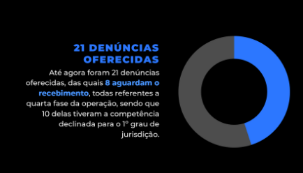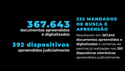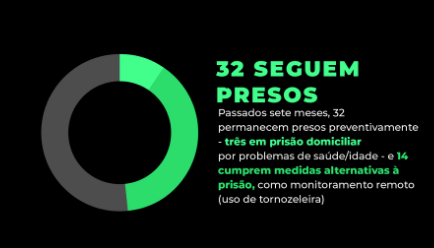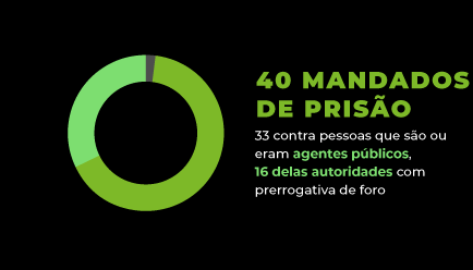 Foram cumpridos 232 mandados de busca e apreensão e 40 de prisão preventiva, sendo 33 contra pessoas que são ou eram agentes públicos, 16 delas autoridades com prerrogativa de foro. Passados sete meses, 30 pessoas permanecem presas preventivamente – três em prisão domiciliar por problemas de saúde/idade – e 8 cumprem medidas alternativas à prisão, como monitoramento remoto (uso de tornozeleira).