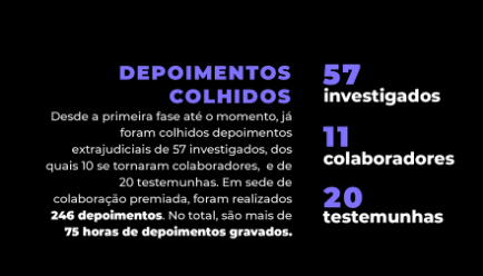 Desde a primeira fase até o momento, já foram colhidos depoimentos extrajudiciais de 57 investigados, dos quais 11 se tornaram colaboradores, e de 20 testemunhas. Em sede de colaboração premiada, foram realizados 246 depoimentos. No total, são mais de 75 horas de depoimentos gravados.
