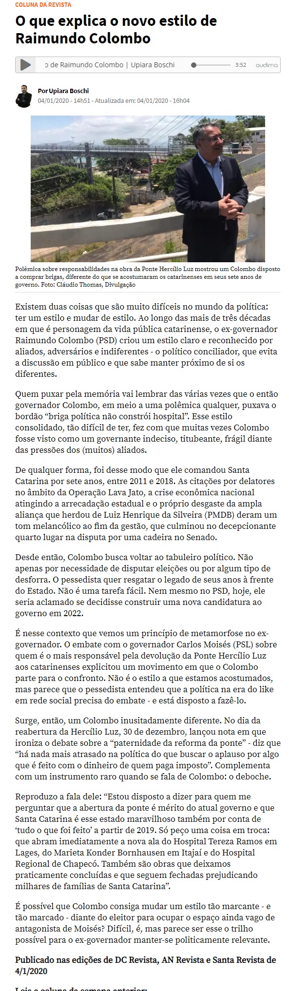 Esse foi um processo licitatório feito pelo Governo Federal. Nós ajudamos na cobrança da aprovação dos projetos que já foram executados, lidando com os técnicos do DNIT, em Brasília, pedindo agilidade na análise, porque o projeto ia e voltava. Continuamos no terceiros projeto, sempre com esperança de que saia mais rápido, porque já tinha dois que tinham sido executados, mas, lamentavelmente, não se iniciaram as obras da terceira passarela. Eu continuo conversando e cobrando, até quando saiu aquela matéria de que não iria mais sair as passarelas, e eu cobrei, dizendo que isso não procede, o contrato não foi encerrado para não executar mais. Me disse o Ronaldo [responsável pelo Dnit, em Lages] que tem expectativa nesse início de ano, mas tenho medo de dar data e preocupação, porque é frustrante. Sofremos para garantir o orçamento, para conseguir fazer com que o processo licitatório aconteça, mesmo que sendo do Executivo, que não é atribuição do Legislativo. É frustrante a gente ver as coisas não acontecerem. A qualidade da obra, das passarelas, a execução, porque estamos falando da proteção da vida das pessoas, é uma necessidade de segurança.