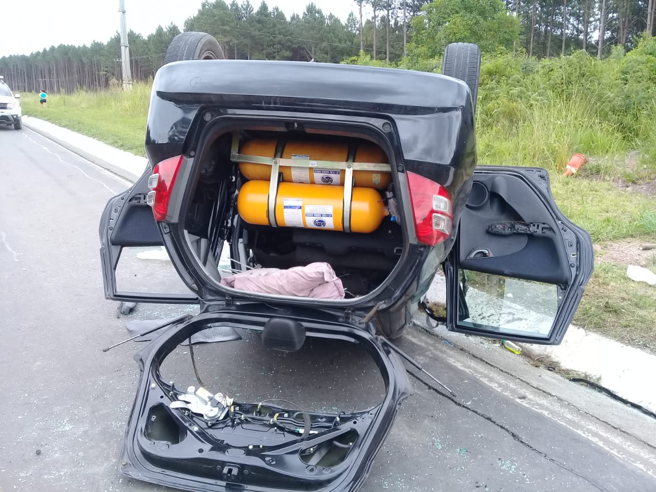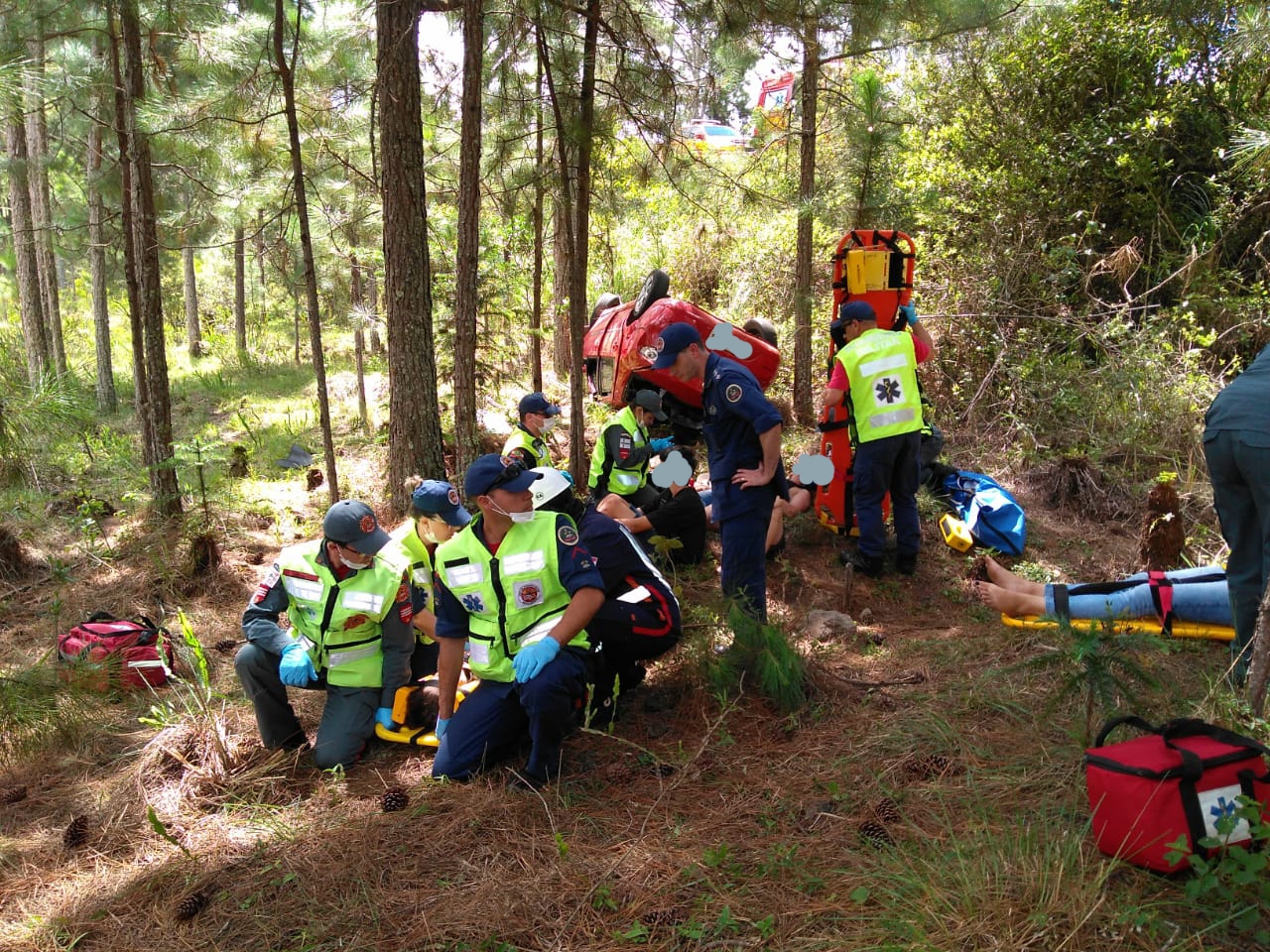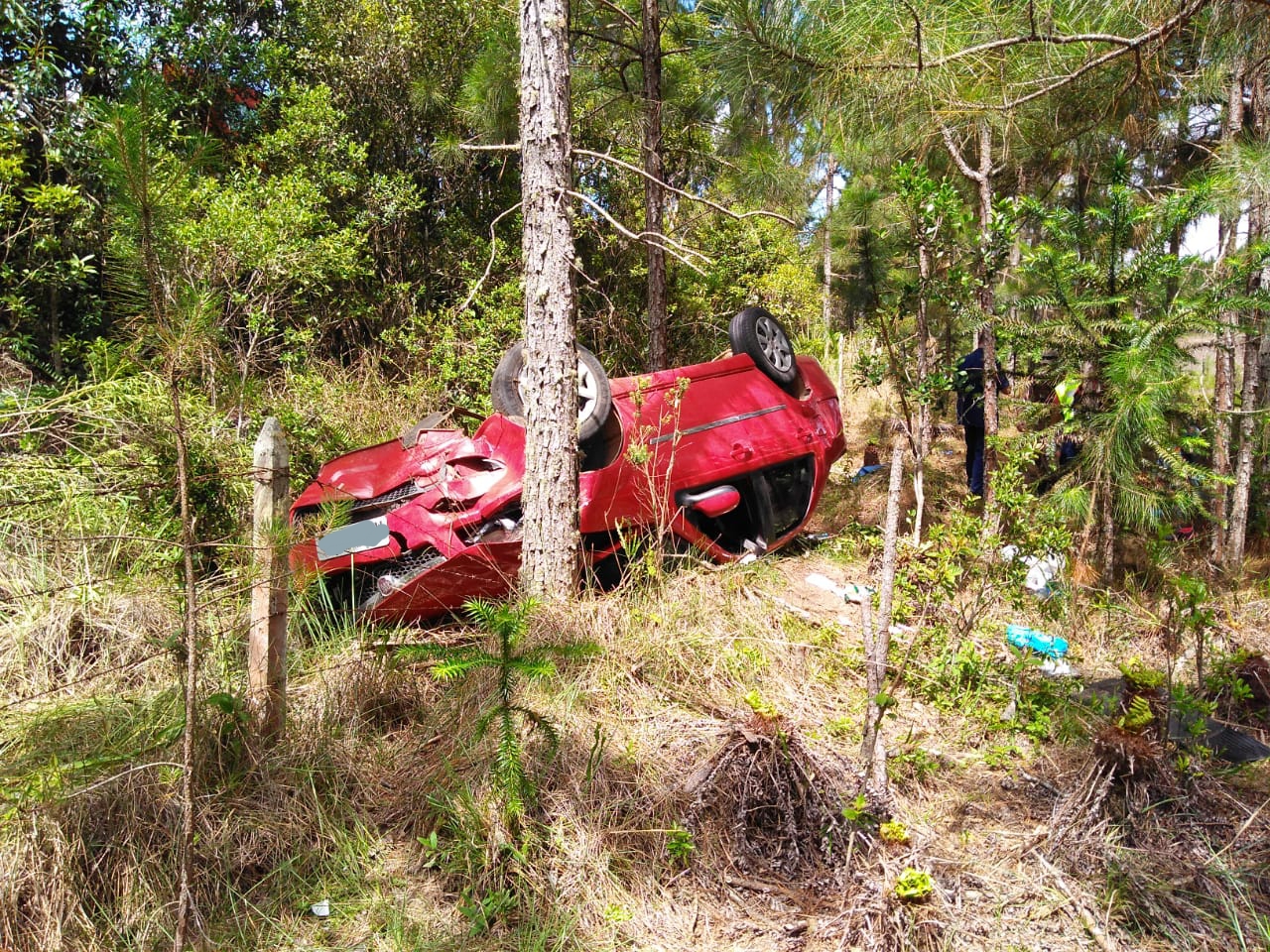 Chegando ao local foi constatado uma saída de pista seguida de queda em ribanceira com capotamento do veiculo Fiat Siena, da cidade de Indaial-sc, conduzido pela Sra E. T. C, 37 anos, que apresentava suspeita de fratura na perna direita e ferimentos na face, e foi conduzida pela USA do SAMU, tendo mais 04 ocupantes: a Sra E. C. F 19 anos, com suspeita de fratura na região pélvica e dor abdominal, também conduzida pela USA do SAMU, a Sra L. A. C , 40 anos que queixava-se de dores na região toráxica e ferimento na região ocipital da cabeça, o menor D. A. C, 12 anos com escoriações no pescoço, ambos conduzidos pela vtr ASU-339 , e o menor V. C. C 08 anos, com hematoma na região frontal e dor abdominal, conduzido pela vtr ASU-359 da obm de Otacílio Costa que esteve presente e prestou apoio as guarnições de Curitibanos .