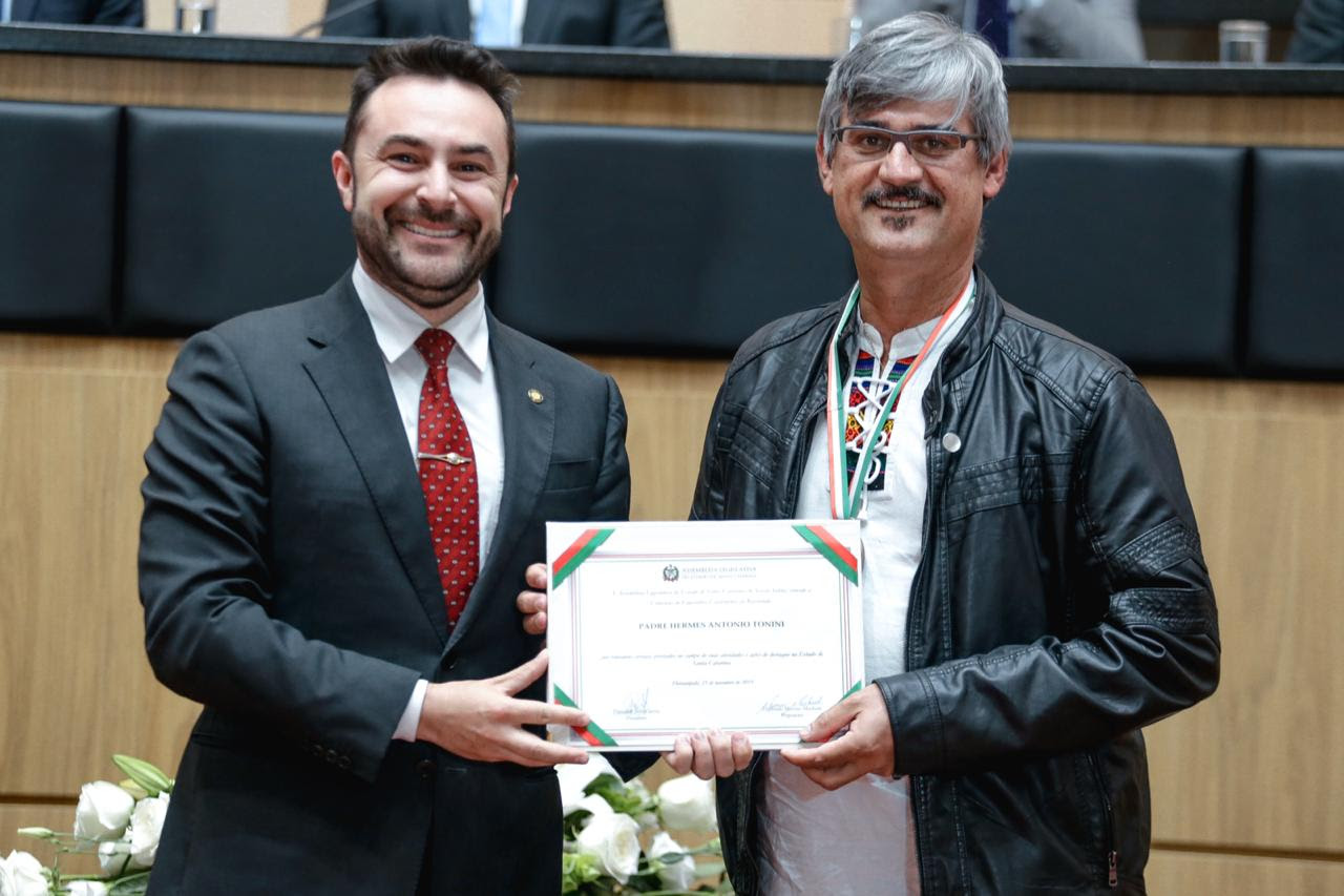 A sessão solene para a entrega da Comenda de Outorga do Legislativo Catarinense aconteceu na segunda-feira (25). O deputado de Lages, Marcius Machado indicou o padre Hermes Tonini para recebe-lo.
